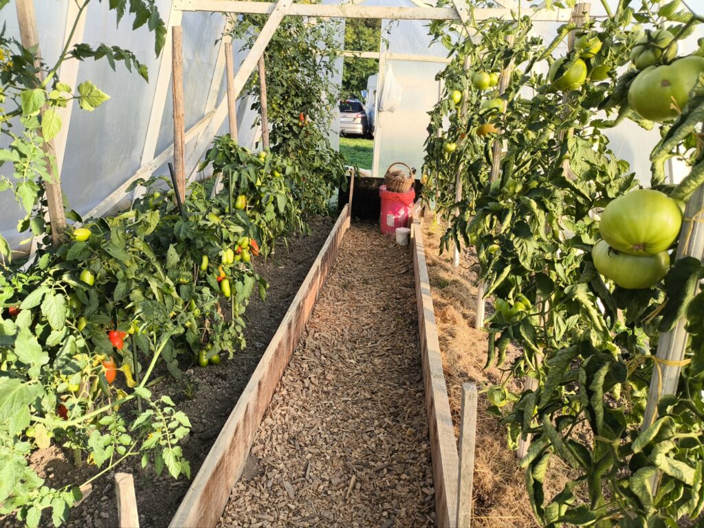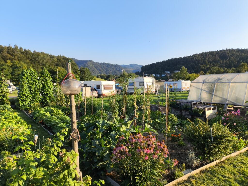 Zwischen den Wohnwagen und Wohnmobilen gibt es Beete, mit Tomaten, Gurken und Beeren. Ob man sich hier zum Frühstück bedienen darf?