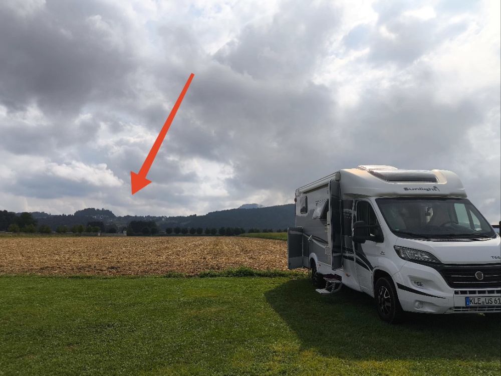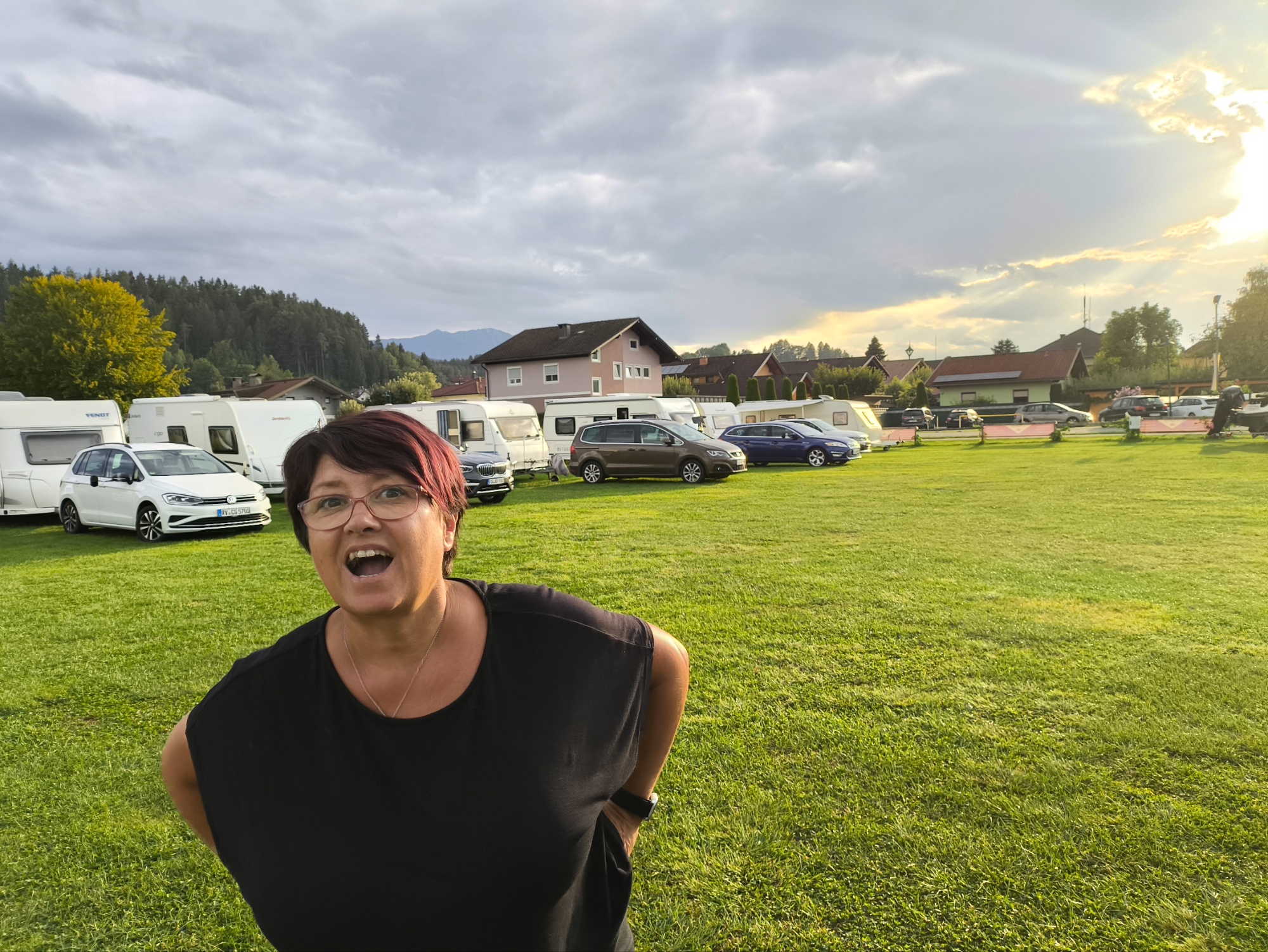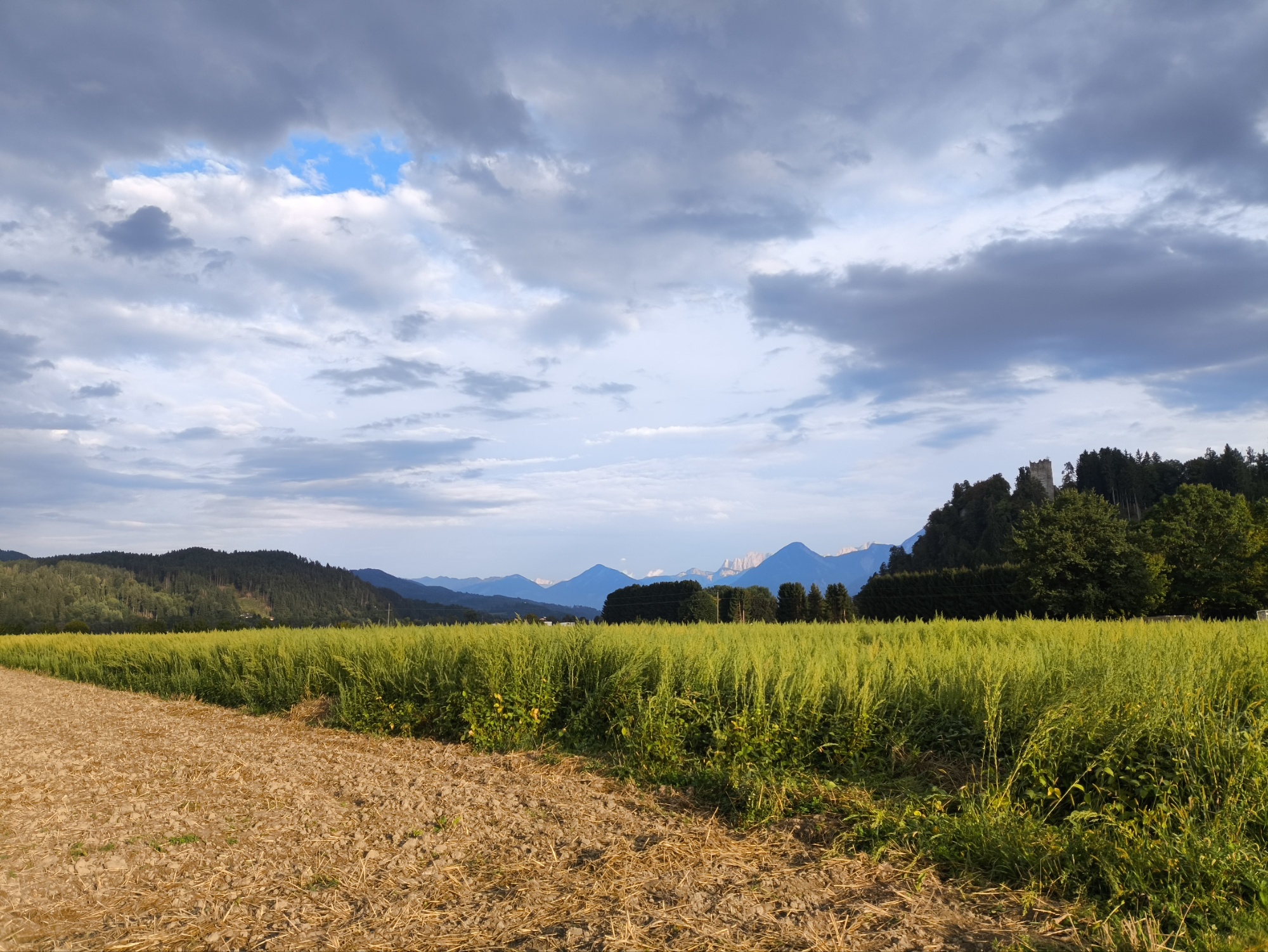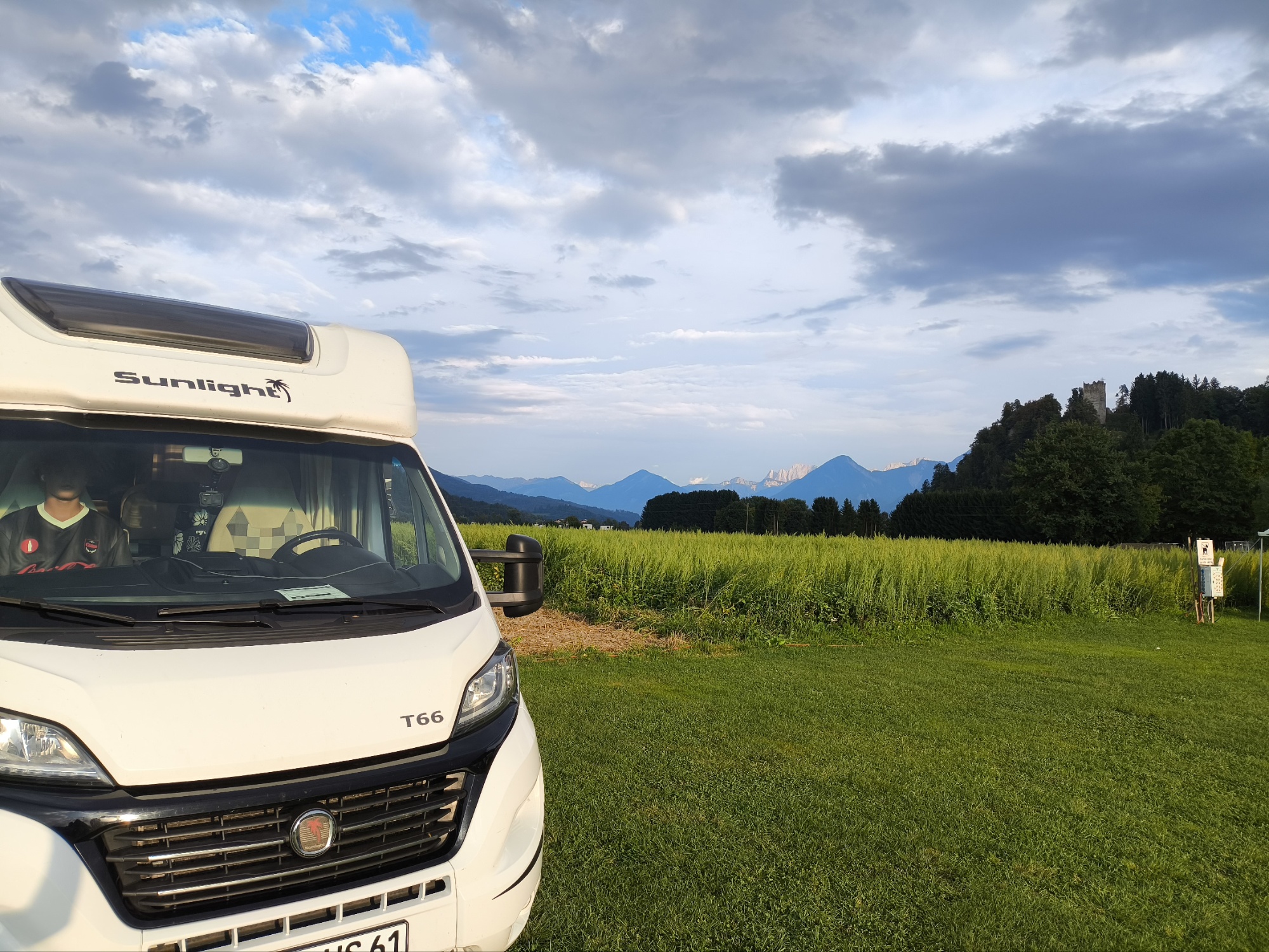 Nach einer gemütlichen Fahrt durch mehrere verschlafene, österreichische Dörfchen kamen wir am Stellplatz in Rosegg am Wörthersee an: ein schöner, gerader Platz direkt am Acker und mit Alpenblick… Landluft und -geruch inklusive…