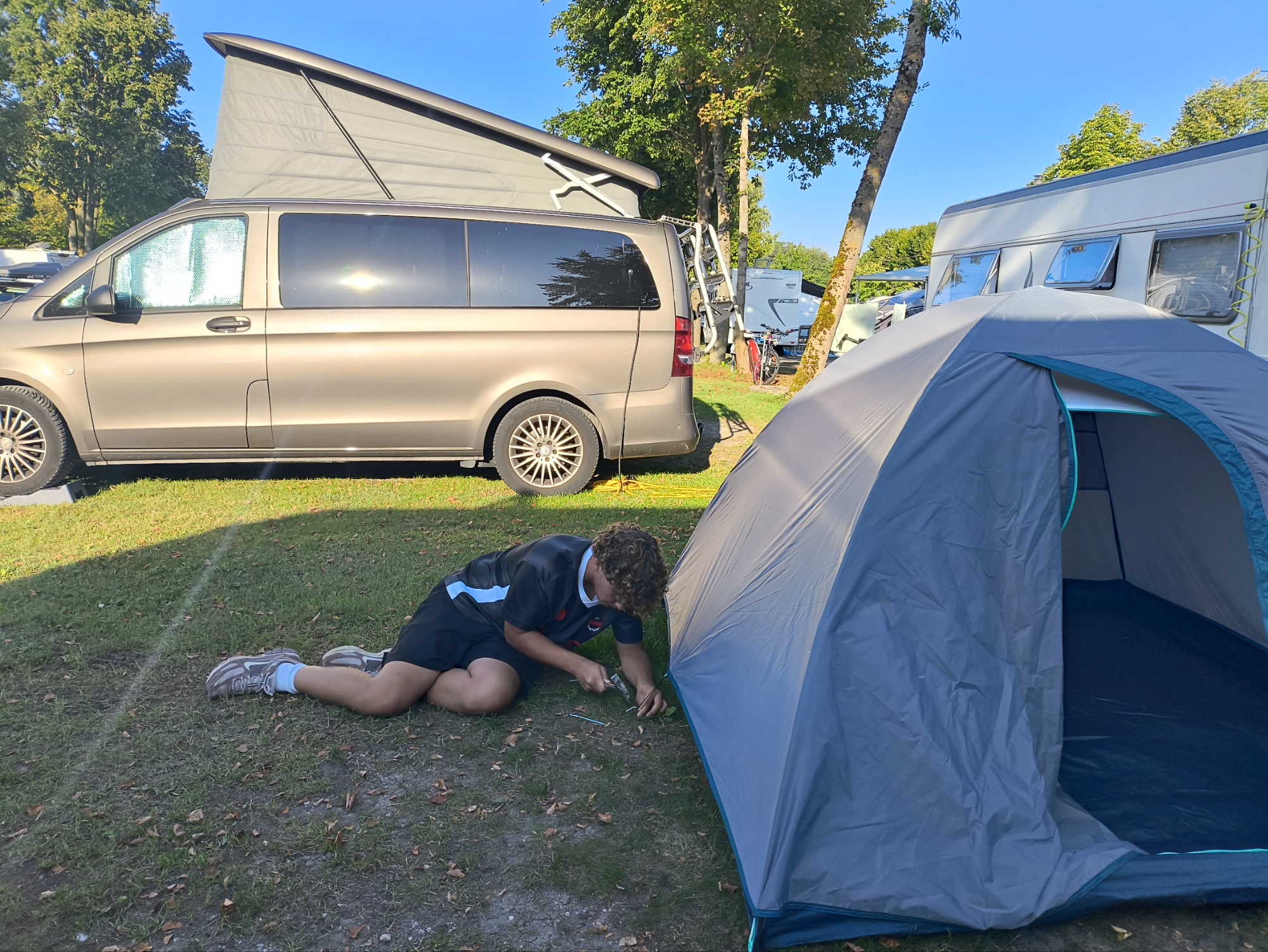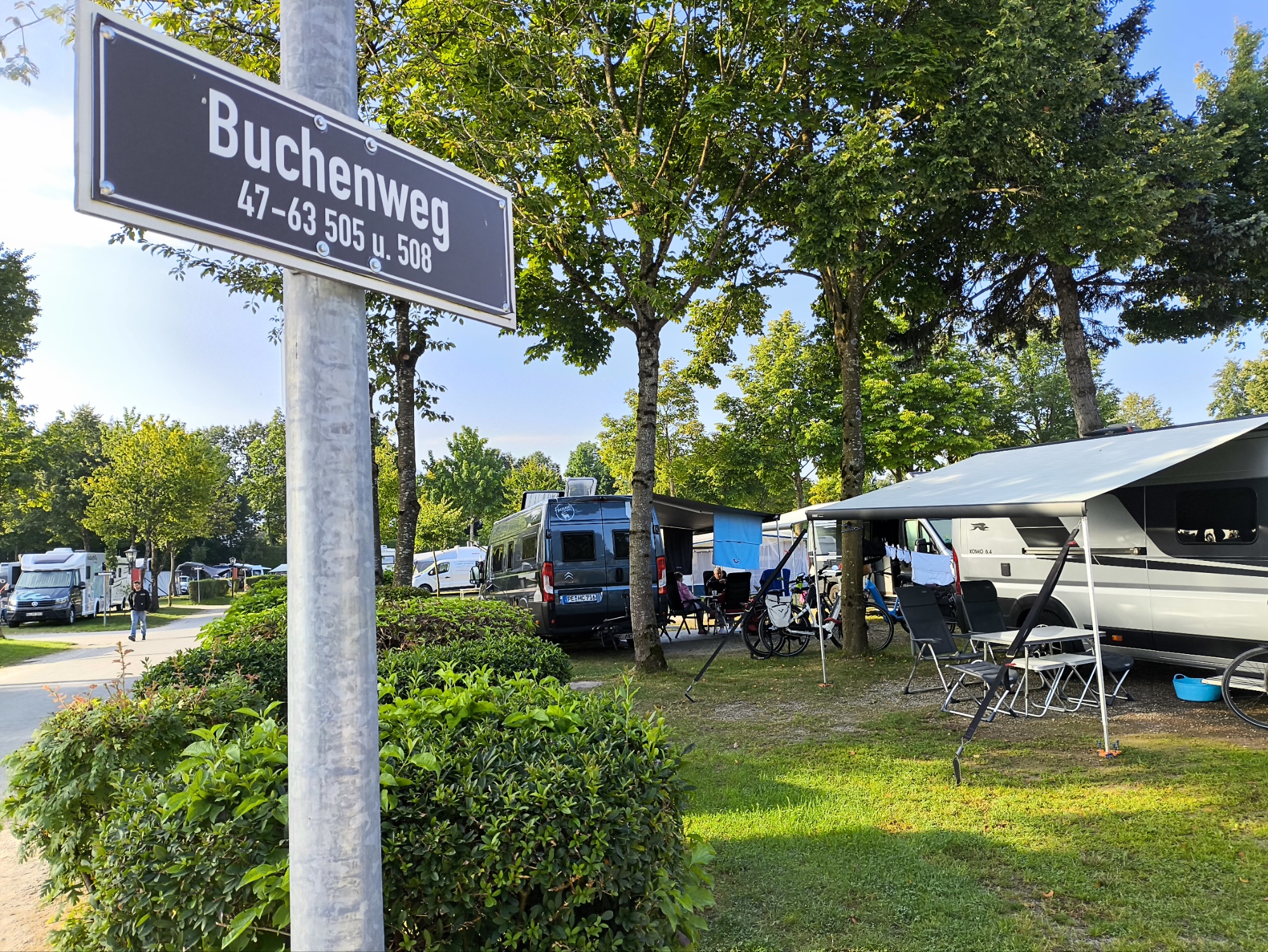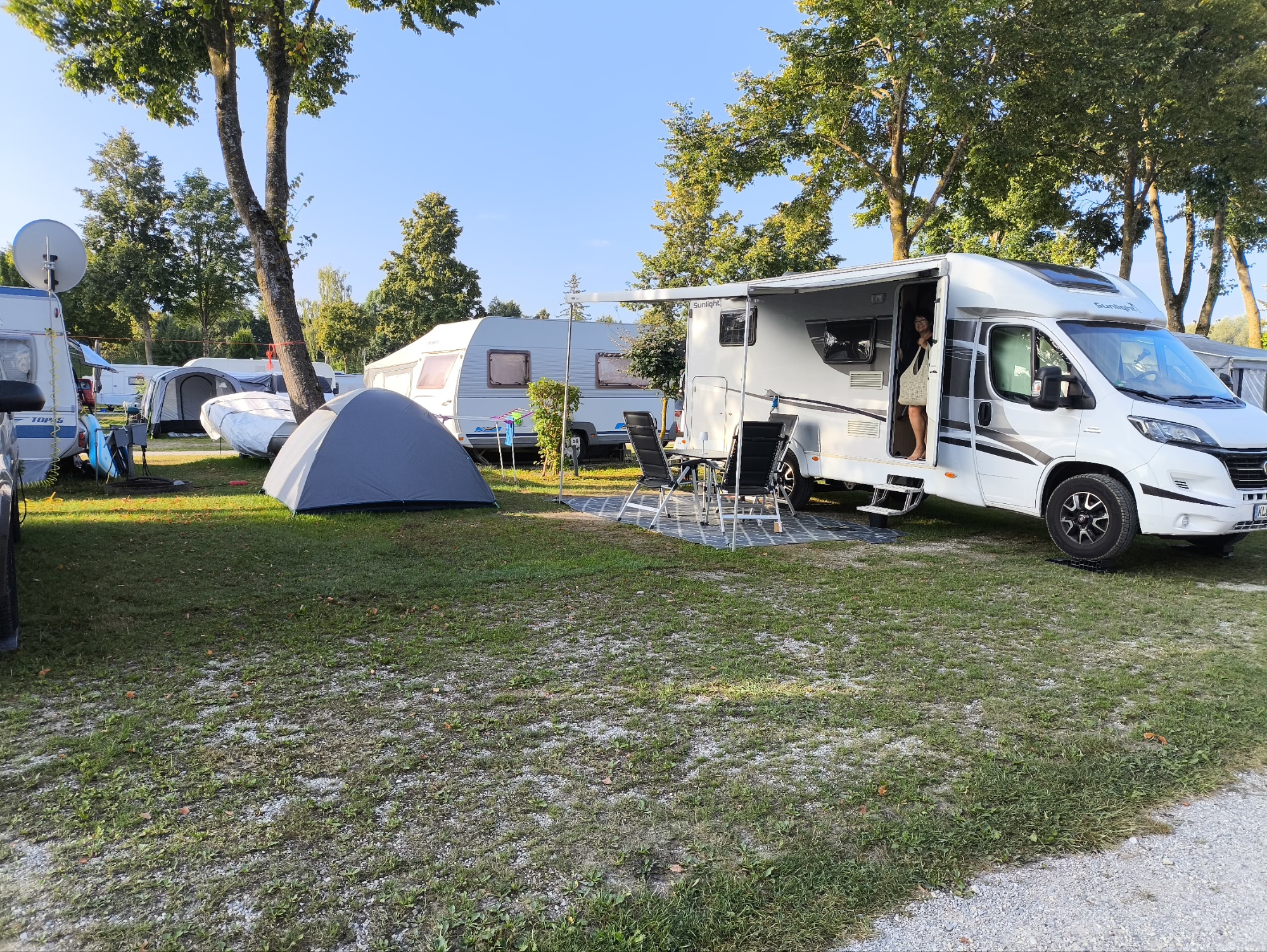 Sehr schöner, im Vergleich zu Kroatien großer Platz unter Bäumen. Der See ist direkt an der Rezeption, von unserem Platz keine 200 Meter entfernt. Erster Eindruck: sehr sauber und ordentlich… Man merkt, wir sind in Bayern… 😉
