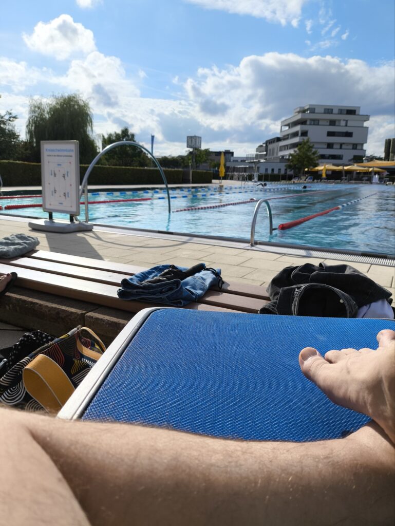 Und danach konnten wir noch von 18 bis 20 Uhr in das Freibad neben dem Campingplatz: ganz tolles Freibad und fast menschenleer… Wir haben uns nur gefragt, wo sind die Leute geblieben? Am Wasser kann’s nicht gelegen haben… erwärmt und 25 Grad warm!